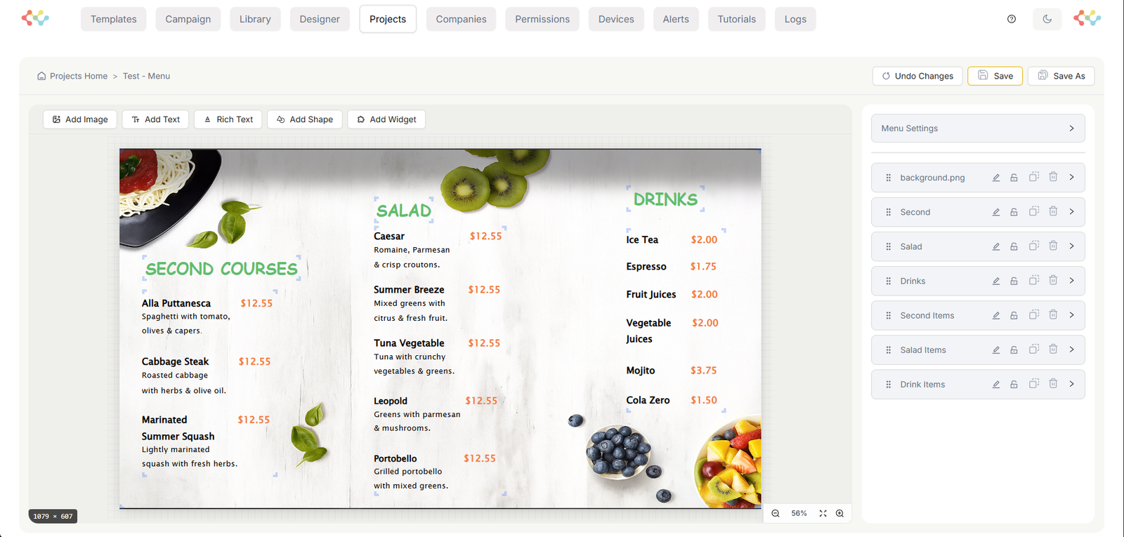 Create layered digital sign content with multiple widgets, text, graphics, and interactive elements for menus, testimonials, and other dynamic signage.